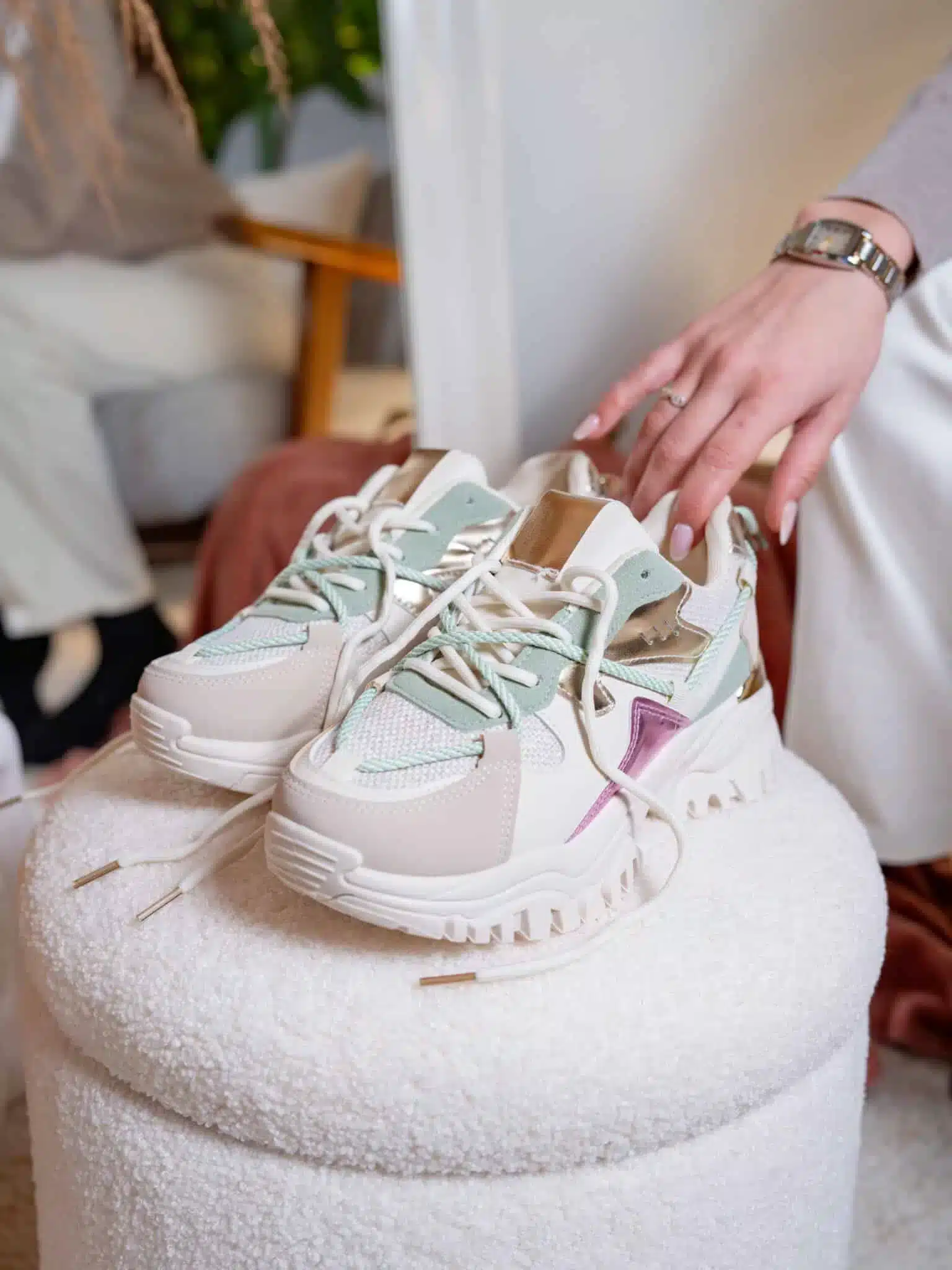 Baskets femme vert pastel à lacets avec semelle épaisse de 3 cm et détails métallisés dorés et violets pour un look audacieux et moderne | Lila & Zoé