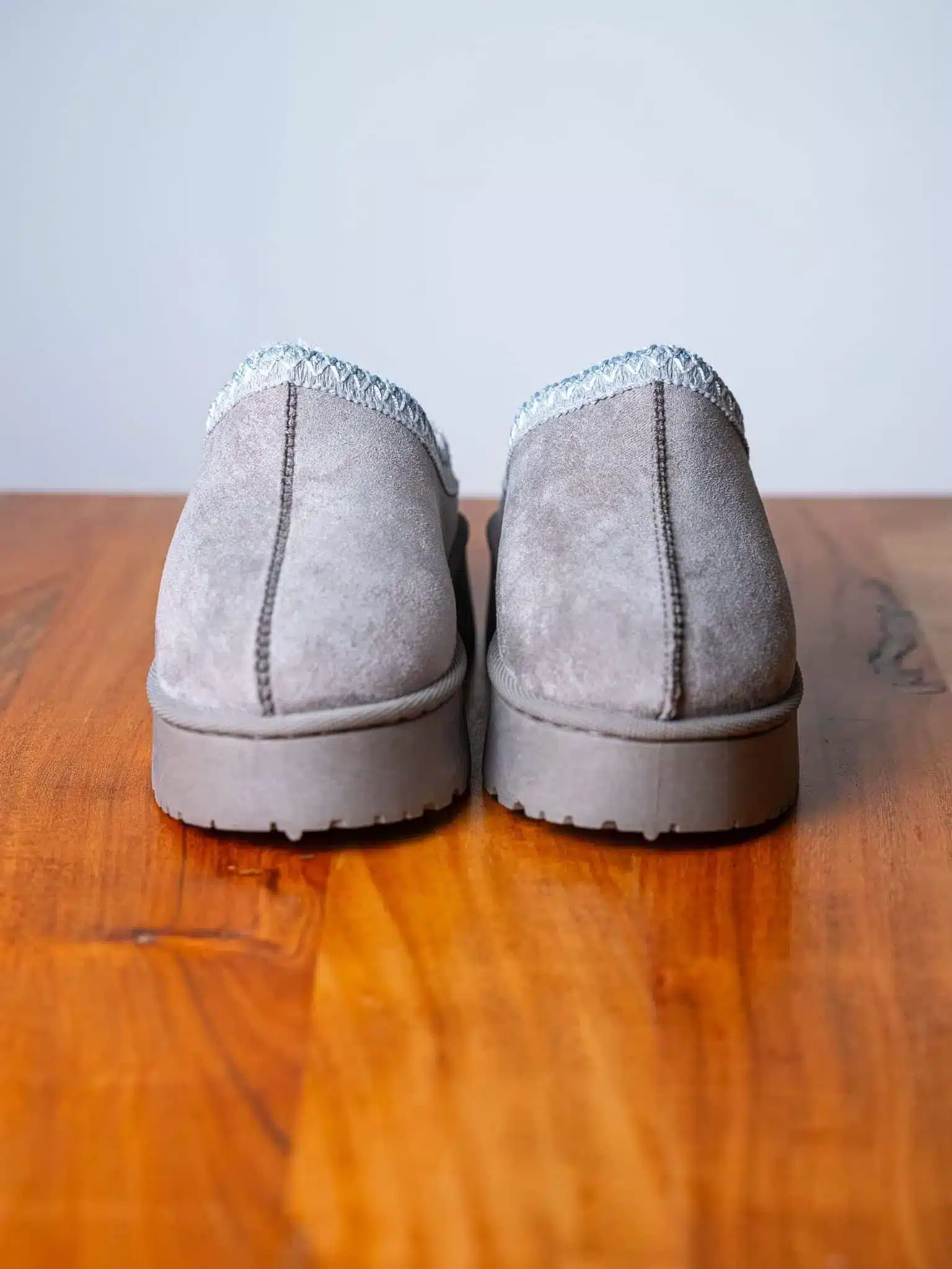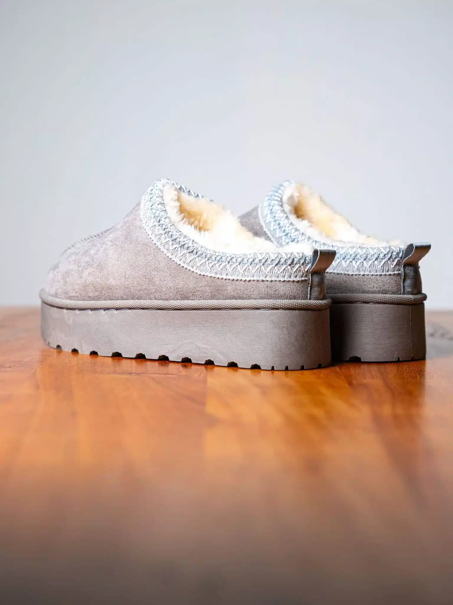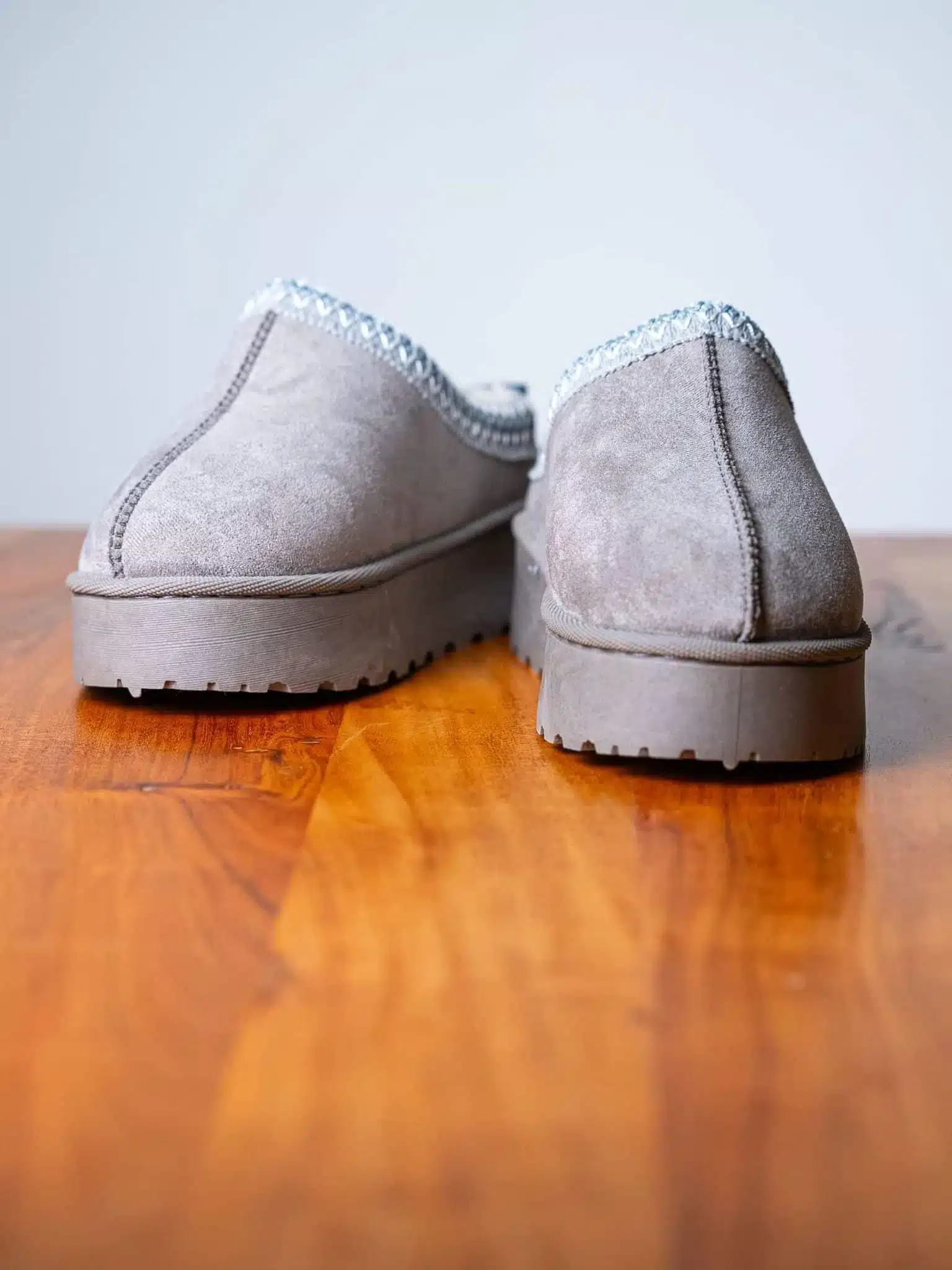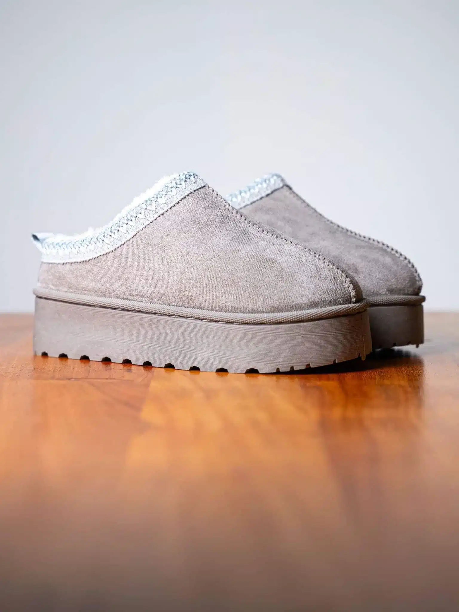 Les chaussons Flora en gris sont parfaits pour allier style et confort à la maison ! Avec leur effet daim raffiné, leur intérieur fourré doux et leur semelle compensée de 5 cm, ils te garantissent des moments cosy tout l’hiver.