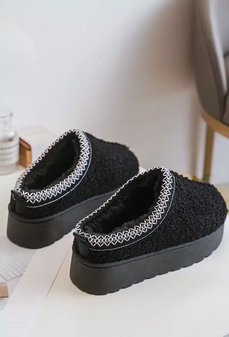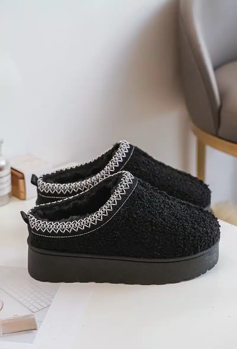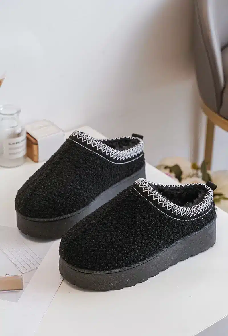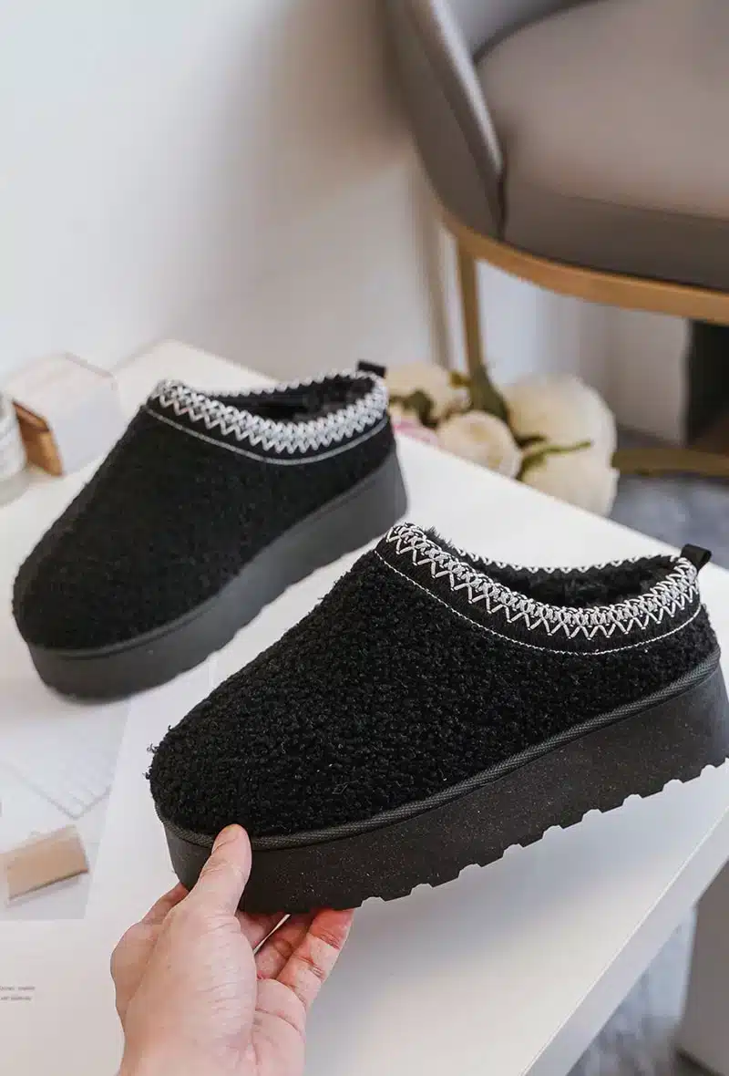 Les chaussons Miwa en noir sont l’indispensable pour te sentir bien à la maison ! Leur matière façon moumoute, leur semelle de 5 cm et leur liseré élégant les rendent aussi stylés que confortables.